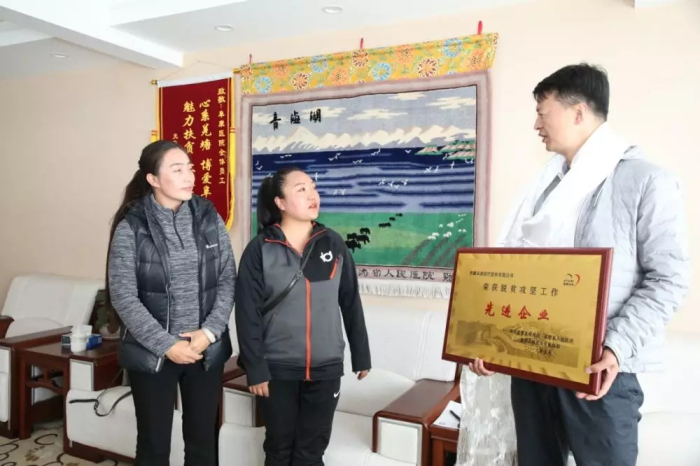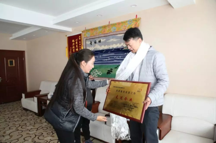 隨后,才旦卓嘎向阜康醫(yī)療股份有限公司黨委書(shū)記、董事長(zhǎng)王斌頒發(fā)"脫貧攻堅(jiān)工作先進(jìn)企業(yè)”匾牌。