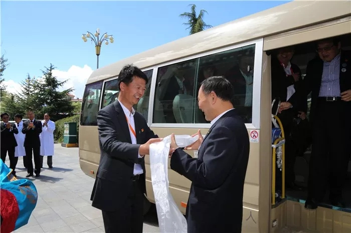 西藏阜康醫(yī)療股份有限公司黨委書(shū)記、董事長(zhǎng)王斌同志為蒞臨阜康醫(yī)院考察指導(dǎo)的領(lǐng)導(dǎo)獻(xiàn)上哈達(dá)