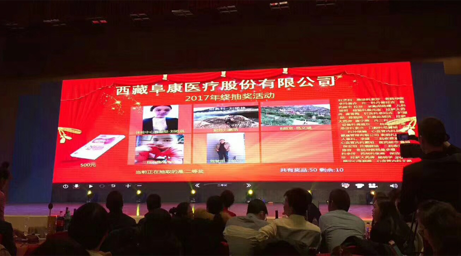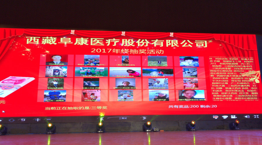 2018年1月10日,西藏阜康醫(yī)療股份有限公司新年團(tuán)拜會(huì)在拉薩洲際酒店舉行,下午四點(diǎn)來(lái)自西藏阜康醫(yī)院、婦產(chǎn)兒童分院、心腦血管分院、健康體檢中心、阜康大藥房、超市的員工陸續(xù)來(lái)到會(huì)場(chǎng)。下午五點(diǎn),主持人劉連福院長(zhǎng)宣布會(huì)議正式開(kāi)始,場(chǎng)內(nèi)音樂(lè)響起,董事長(zhǎng)王斌帶領(lǐng)醫(yī)院領(lǐng)導(dǎo)和特邀嘉賓入場(chǎng),會(huì)場(chǎng)立刻響起雷鳴般的掌聲和歡呼聲。
