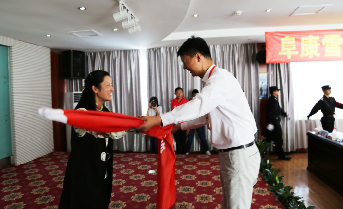 西藏志愿服務聯(lián)合會副秘書長為阜康雪域天使志愿者服務隊授予隊旗