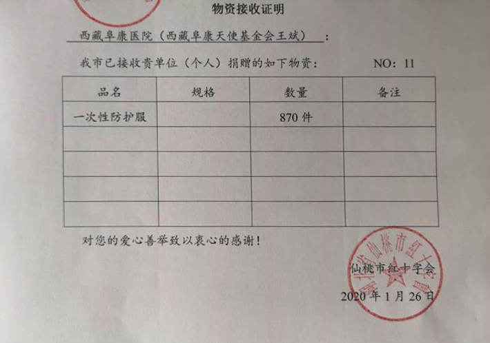 1月26日,在公司黨委書記、董事長王斌先生的指示下,阜康醫(yī)療緊急向湖北仙桃市紅十字會捐贈了價值10萬元的870套防護服,隨后在2月28日分別向湖北省紅十字會、仙桃市紅十字會捐款100萬元和10萬元,支持湖北省和仙桃市"抗擊新冠肺炎項目”。