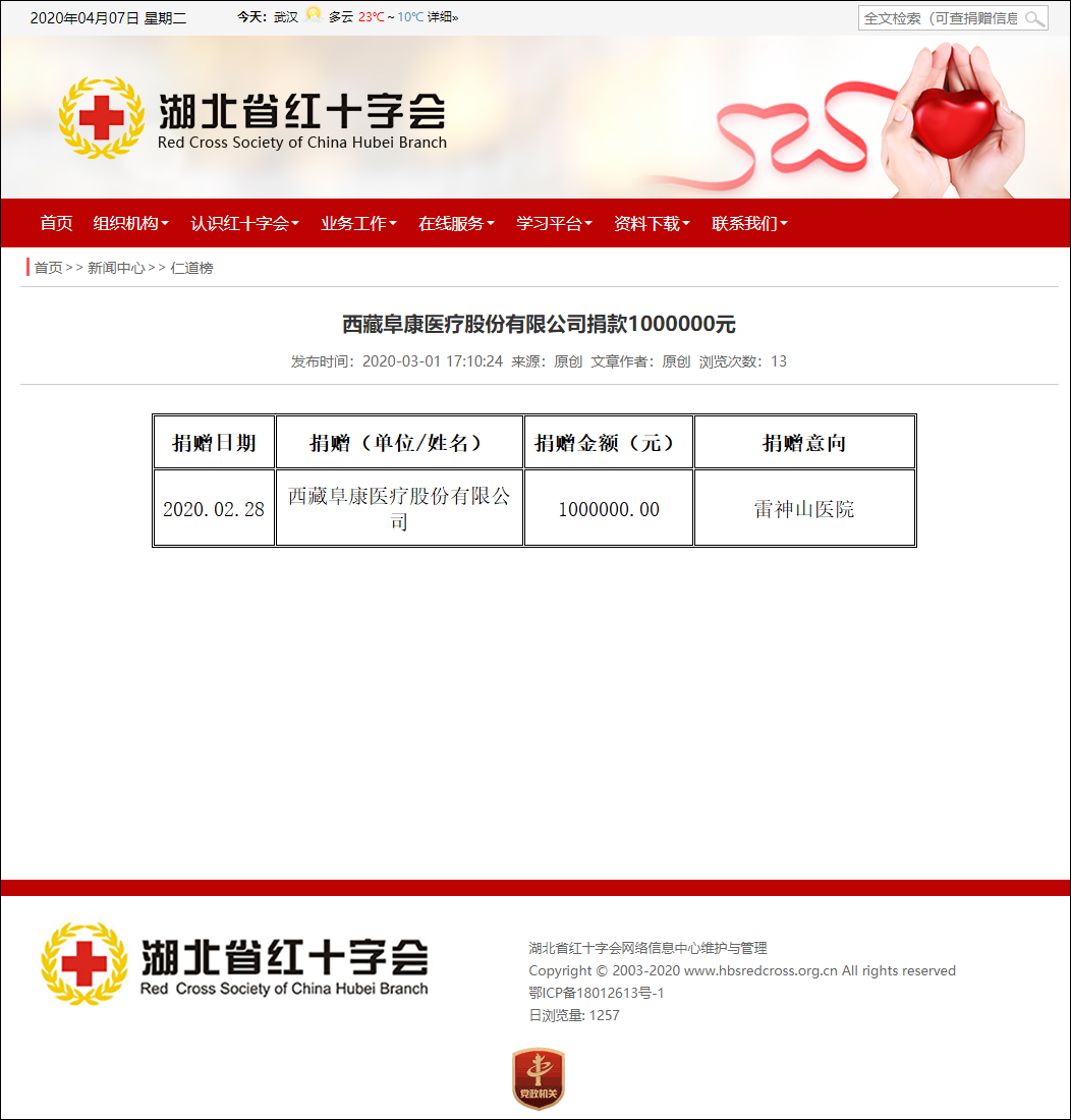 日前,湖北省仙桃市紅十字會向西藏阜康醫(yī)療股份有限公司寄來一份榮譽證書,感謝西藏阜康醫(yī)療在全市抗擊新冠肺炎行動中發(fā)揚"人道、博愛、奉獻”的精神,積極向仙桃市捐款十萬元支持該市"抗疫”工作。