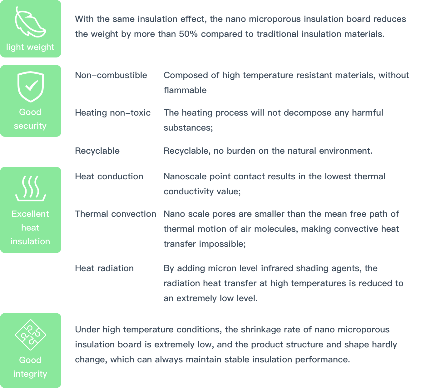 The core material of the nano microporous insulation board is made by mixing nano silica, silicon carbide, and special fibers evenly, and then physically pressing them using patented production equipment. It has high production capacity and good stability; All components of the product are inorganic non-metallic materials, 100% recyclable, non-toxic and harmless.